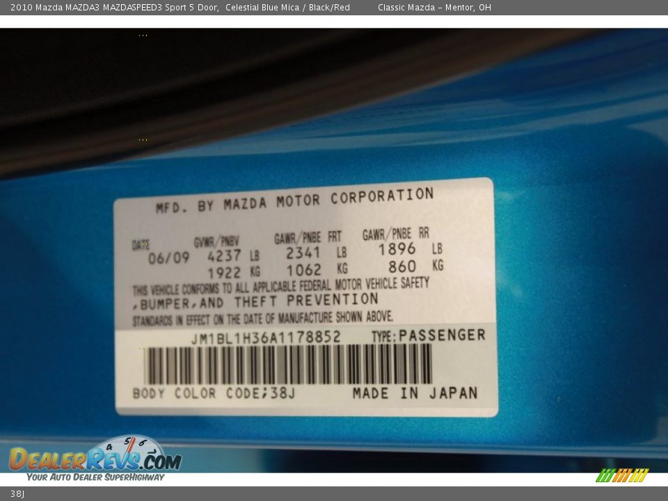 2010 Mazda3 Color Code 38j For Celestial Blue Mica Photo 95813283
